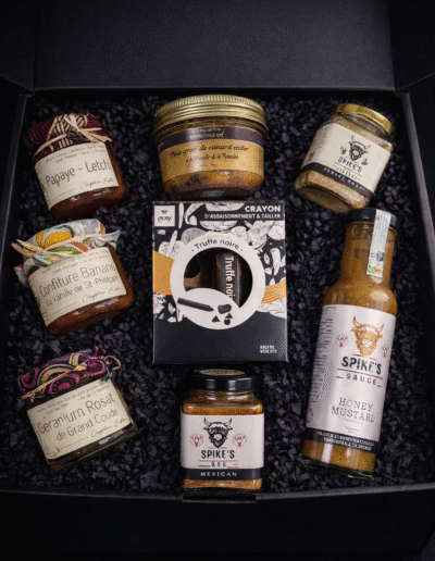 Inclus : foie gras à la vanille de la Réunion 150 g + crayon d’assaisonnement (la touche signature) + une sélection artisanale premium des partenaires Tipopéi, L’Atelier du Pêcher Gourmand et Authentik BBQ.