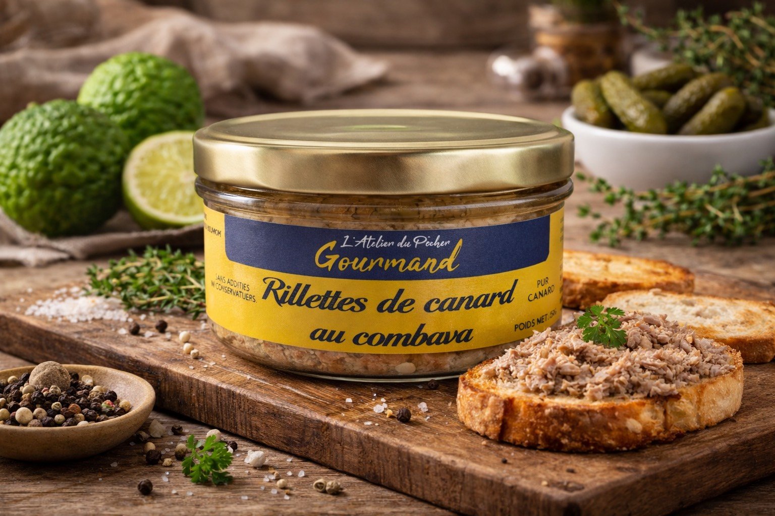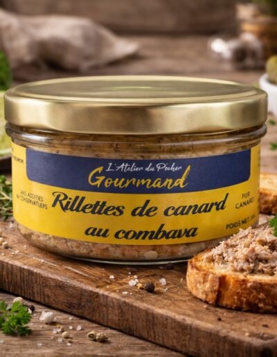 Ces rillettes de canard au combava révèlent une texture fondante et une saveur délicatement travaillée, où la richesse du canard est éclairée par une note zestée, fraîche et élégante. Le combava apporte une touche aromatique fine, légèrement citronnée, qui prolonge la dégustation sans prendre le dessus.
