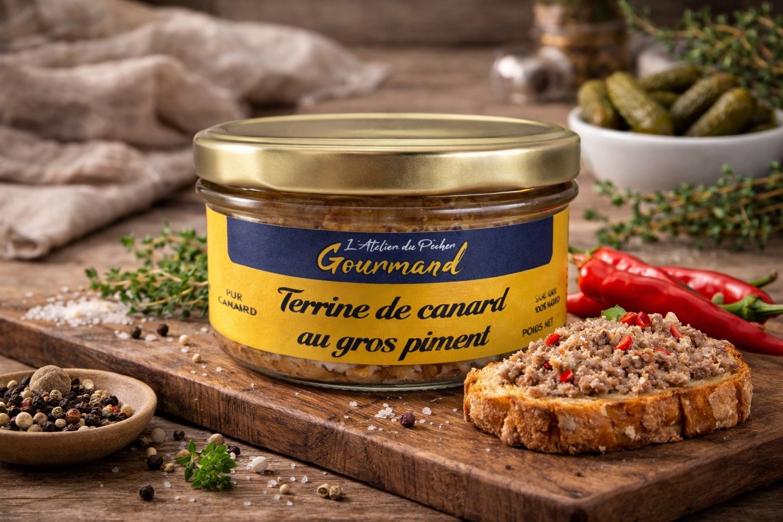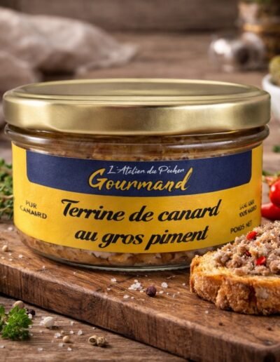 Cette terrine de canard au gros piment offre un bel équilibre entre la rondeur du canard et une note épicée maîtrisée, chaleureuse mais jamais agressive. La texture est généreuse, avec une aromatique qui monte progressivement et laisse une finale nette, légèrement relevée.